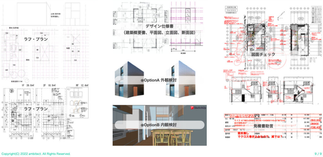 プロジェクトが進捗するにつれて、初期のラフプランから精度の高い細かな図面・デザイン検討を行います。工事会社が決まれば工事会社の図面チェック、そして見積書の助言等を行い、建物完成までサポートします。