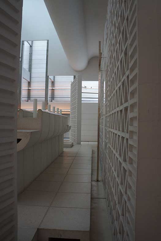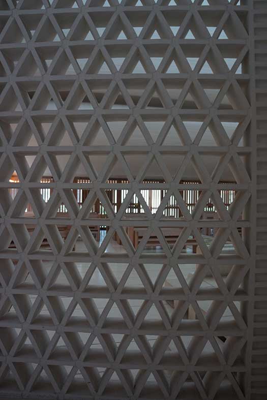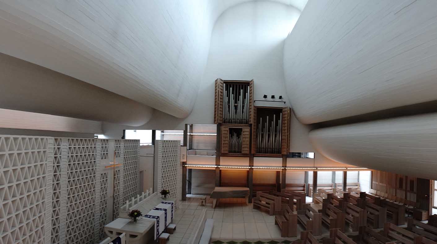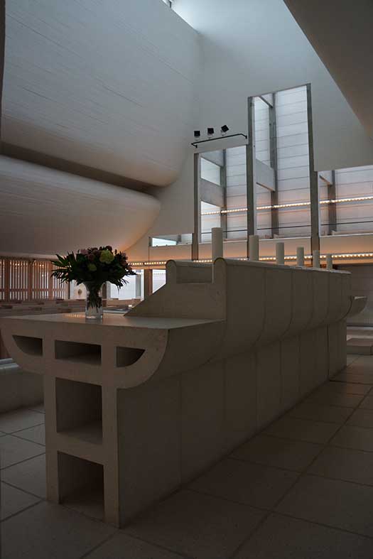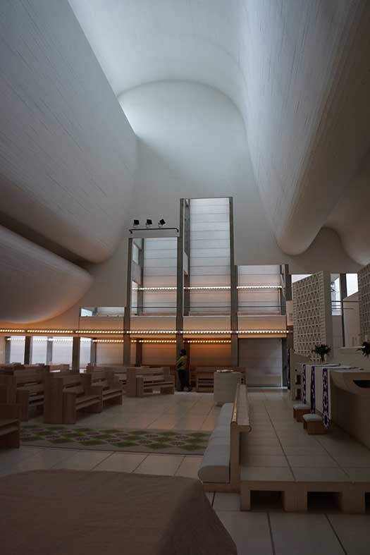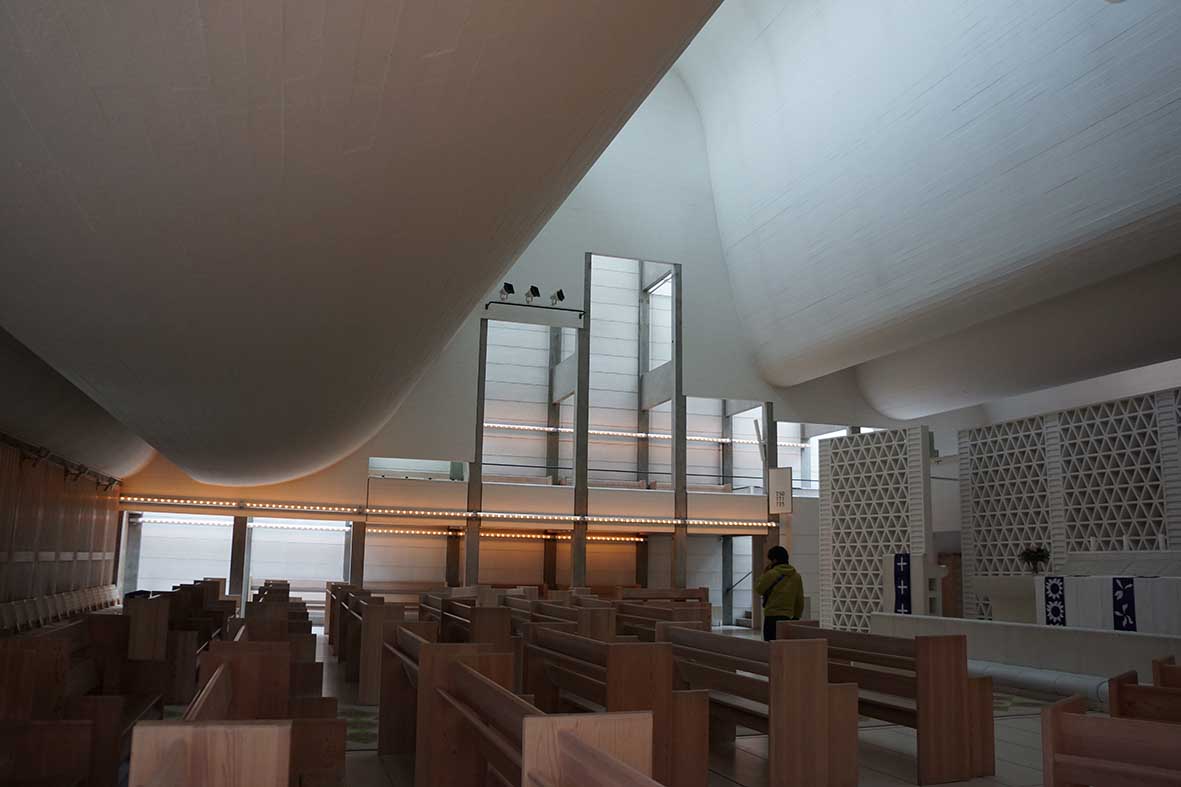 バウスベア教会は有機的な曲面を波打つ天井が特徴的な建築空間を有しており、重々しい天井のヴォリューム(塊)の表面が自然光により柔らかな印象を与えている。